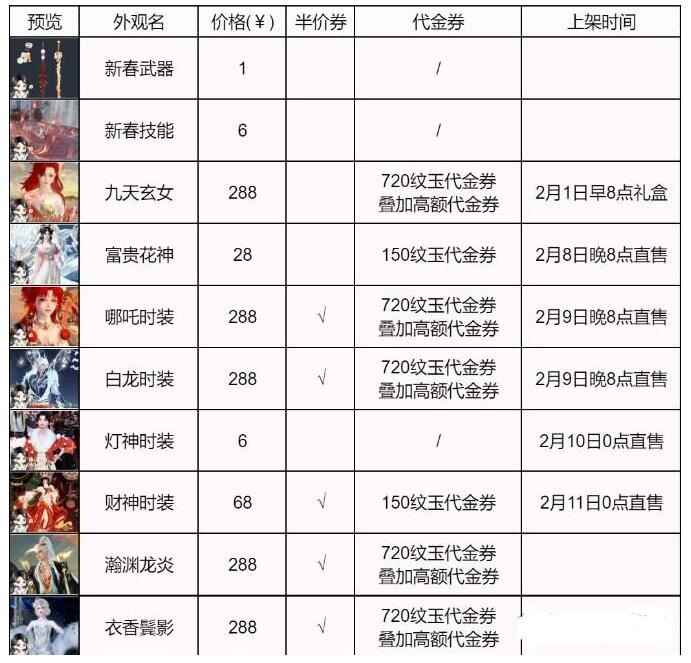 逆水寒手游2024春节限定时装价格分享1、逆水寒手游春节限定时装大全如下,九天玄女为限时礼盒,使用720纹玉代金券叠加150或者高额代金券后,礼盒变为绑定。 2、新春可用优惠: (1)首充重置(送绑玉) (2)600纹玉购买新岁添裳礼包,含5张720纹玉代金券可与其他代金券叠加使用 (3)鸿运蛋充值活动 (4)签到送的高额代金券*2(比之前的加倍多) (5)签到送的半价券*2 (6)150纹玉代金券(之前送的)