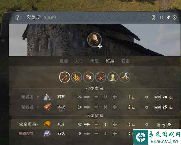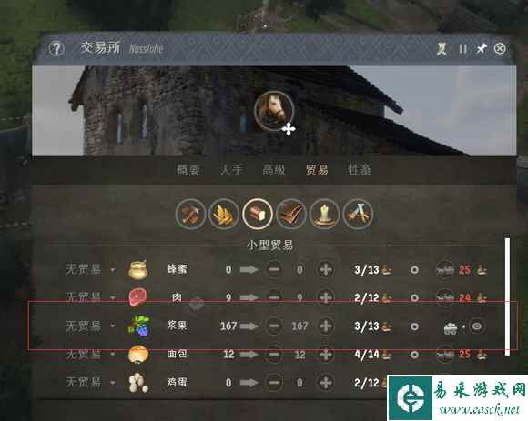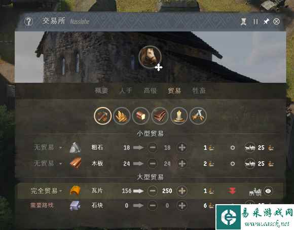 然后就是激动人心的打强盗营地,雇佣兵15-30-45,捡便宜的雇,庄园送的五个随从+一对强盗可以轻松战胜。注意前后夹击,然后让你的随从用防御姿态避免无谓的损失。可以看到强盗营地的收益是非常之高的,给了320声望+143块国库。值得注意的是出了强盗营地马上打,不然AI也会派兵来吃资源,它滚起雪球来这把就饿可以重开了。 至此算是步入正轨,然后就要走交易流的路线了,中间记得给两个营地升二级拿第二个技能点,然后拿到技能点之后马上把这两个地堡拆了,重新建两个一级的,(普通难度下不用拆)二级地堡的满意度根本满足不了。而且二级地堡的好处仅有住的人可以穿棉甲以及造生产建筑。我们所有的高级资源全靠买,不要用任何人力去做生产。