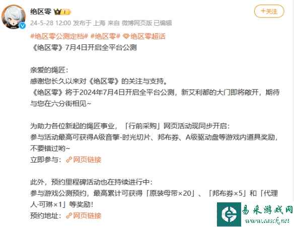 以上就是小编为大家带来的绝区零公测上线时间介绍,希望能够帮助到大家,更多精彩游戏资讯攻略内容,就在网。 推荐攻略》》》行前采购预抽卡网页活动说明