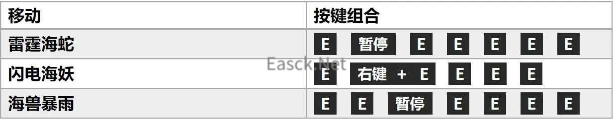 旋风海妖出招表 搓招的话推荐第二招(闪电海妖)和第三招(海兽暴雨),第二招(闪电海妖)比较容易搓招,按住鼠标右键然后EEE就能使出来,第三招(海兽暴雨)的伤害最高,先E两下暂停一下然后再按EEE才能搓出来,不过这招需要小朋友练习一下才能顺畅的使出来。 下面是架势演示。