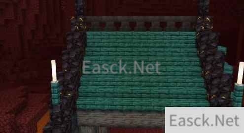 接着,用磨制黑石砖,在如图位置叠加6层,并且顶部相连接,使用倒置磨制黑石楼梯,做出大门的形状。