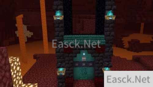 我们回到大门处,在如图四角放置红色下界砖,并且在玄武“柱子”上,使用黑石楼梯装饰摆放,留出一至两层空隙处摆放灵魂火。