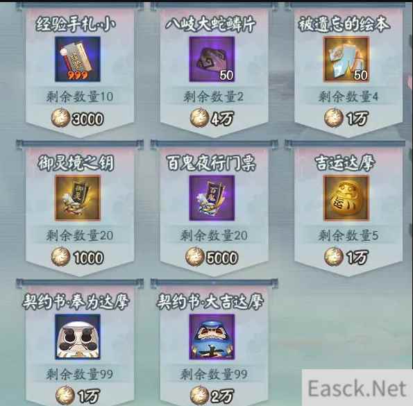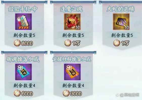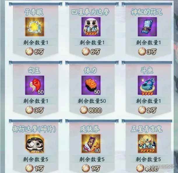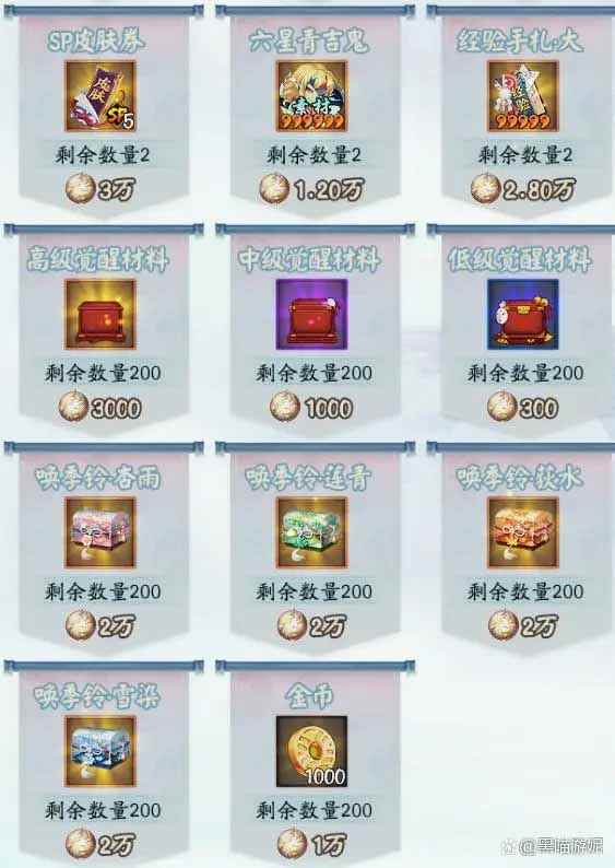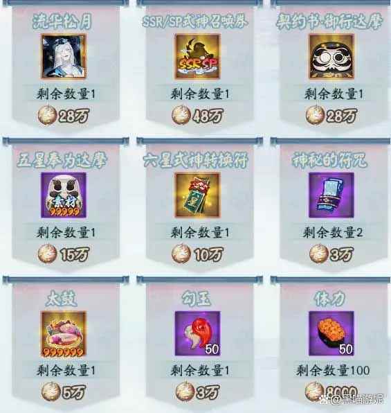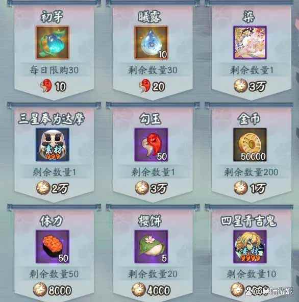 具体的商店资源方面包括白蛋+蓝蛋x99、三星白蛋x1、紫蛇皮x100、金达摩x5、百鬼票x20、御灵钥匙x20、遗忘绘本x200、小经验书x10、四星青吉鬼御魂x10、樱饼x100、体力x2500、金币x1000W、勾玉x50