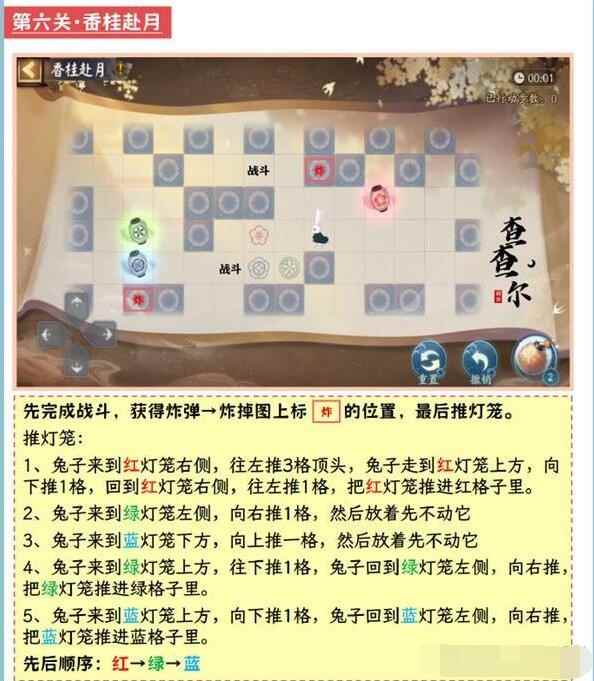 1.阴阳师香桂赴月需要先完成战斗,获得炸弹→炸掉图上标炸的位置,最后推灯笼。 2.香桂赴月推灯笼兔子先来到红灯笼右侧,往左推3格顶头,兔子走到红灯笼上方,向下推1格,回到红灯笼右侧,往左推1格,把红灯笼推进红格子里。 3.兔子来到绿灯笼左侧,向右推1格,然后放着先不动它。 4.兔子来到蓝灯笼下方,向上推一格,然后放着先不动它。 5.兔子来到绿灯笼上方,往下推1格,兔子回到绿灯笼左侧,向右推,把绿灯笼推进绿格子里。 6.兔子来到蓝灯笼上方,向下推1格,兔子回到蓝灯笼左侧,向右推,把蓝灯笼推进蓝格子里。 先后顺序:红→绿→蓝 以上就是小编整理带来的阴阳师香桂赴月灯笼怎么移动-香桂赴月通关攻略,更多精彩内容,请点击关注! |