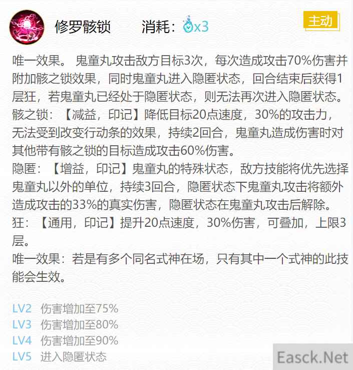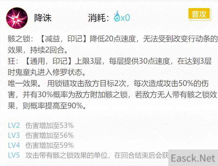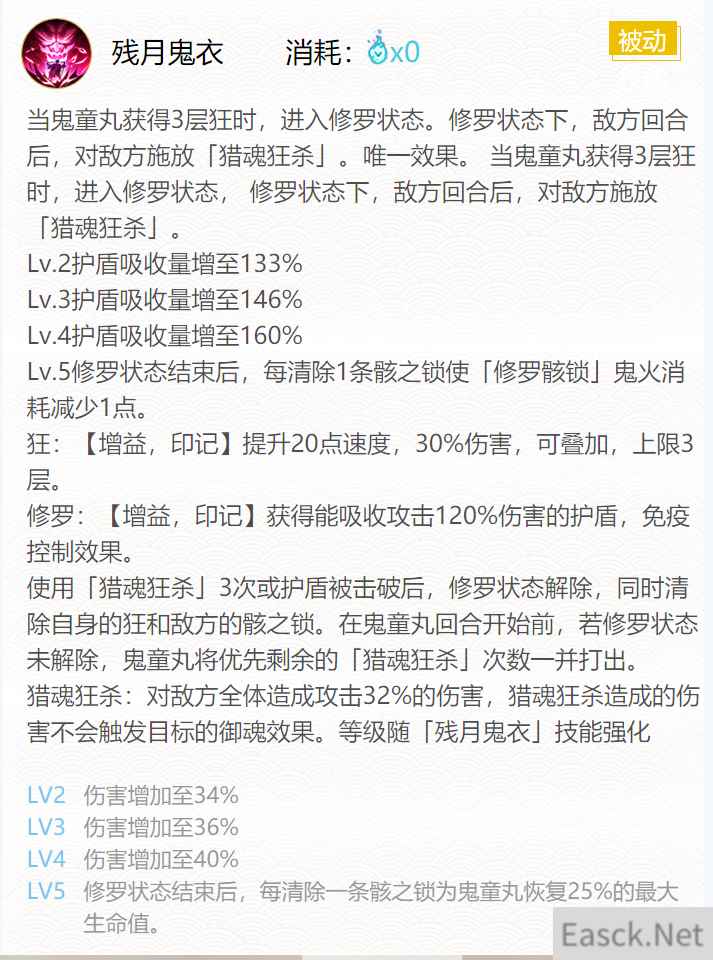 推荐理由: 1、鬼童丸搭配钟灵,主属性速攻爆,输出流,随缘控制和点控; 2、鬼童丸带钟灵胜率高,但是要达到+146才可以使用。 式神技能 降诛(0火)