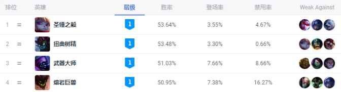 要说这个版本大树有多强,大伙看看数据就知道了,他与波比一起成为上路T1,胜率还在一个比较吓人的位置,在这个上路纯坦克比较吃亏的版本里,能够打出这样的数据已经很离谱了。