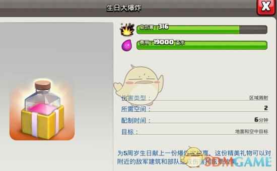 部落冲突生日大爆炸有小编为你介绍。你有一份生日礼物待接受,砰!作为部落冲突周年庆推出的法术,其有什么效果?需要多少费用?来看看这份部落冲突生日大爆炸图鉴吧。 生日大爆炸: 总伤害:316 费用:19000圣水 伤害类型:区域溅射伤害 所需空间:2格 目标:地面和空中目标 效果:可以摧毁建筑和部队,还能造成眩晕效果,非常实用。