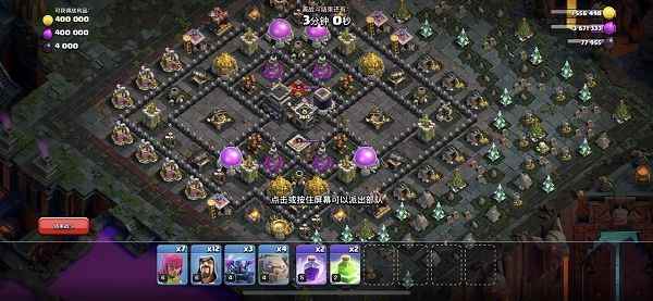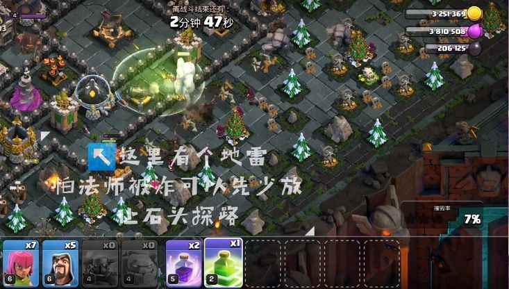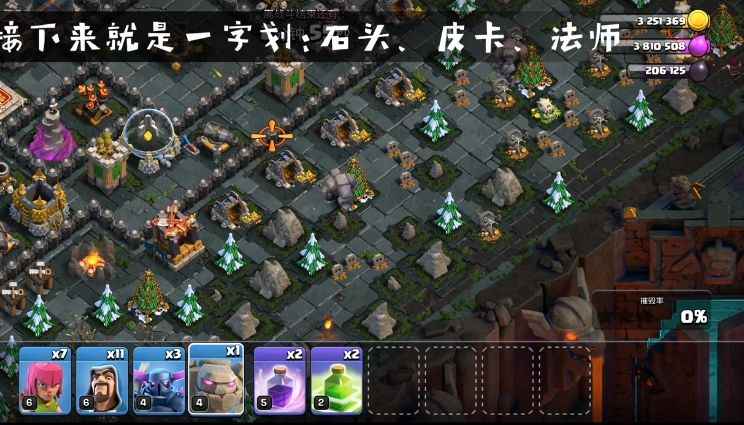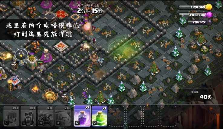 《部落冲突》十周年挑战赛2013通关攻略1、右上方有个电塔,我们可以先放置石头和法师来节省更多的时间。