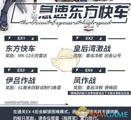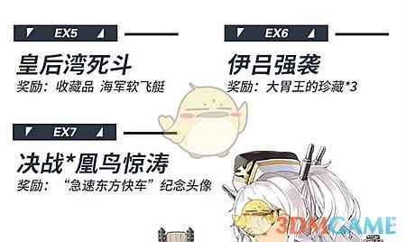 急速东方快车活动关卡介绍: EX1:东方快车 奖励:MK-12火控雷达 EX2:皇后湾激战 奖励:重巡洋舰 旧金山号 EX3:伊吕作战 奖励:61厘米四联试制F3鱼雷 EX4:凤作战 奖励:重巡洋舰 德梅因 通关后会开放困难模式: EX5:皇后湾死斗 奖励:收藏品 海军软飞艇 EX6:伊吕强袭 奖励:大胃王的珍藏*3 EX7:决战 凤鸟惊涛 奖励:“急速东方快车”纪念头像 急速东方快车活动关卡通关攻略 东方快车e1 皇后湾激战e2 伊吕作战e3 凤作战e4 皇后湾死斗e5 伊吕强袭e6 决战凰鸟惊涛e7