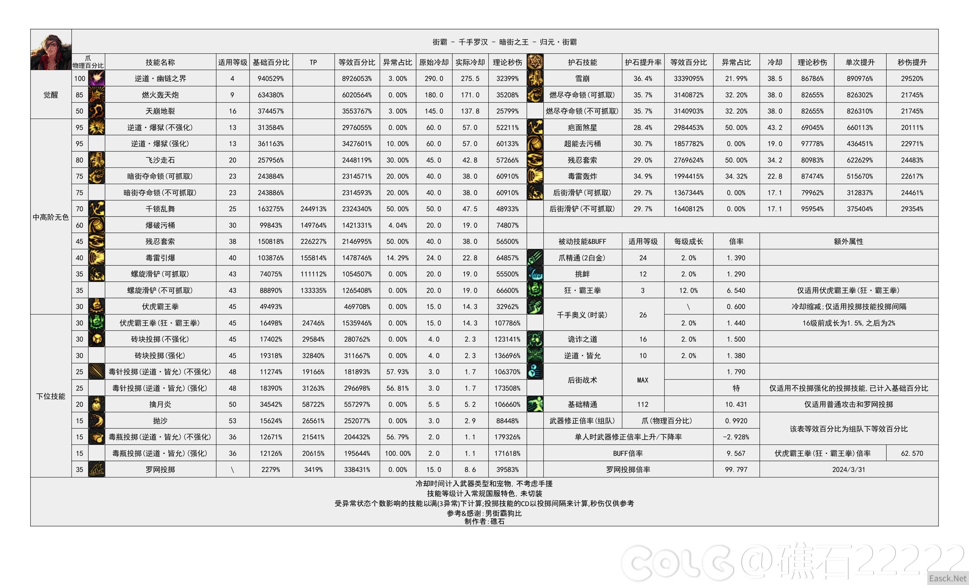 DNF国服16周年庆版本进行了职业平衡,很多职业加强了,因此输出数据也有所改动,比如男街霸,那么DNF国服16周年庆男街霸输出数据是多少?下面就给大家带来DNF国服16周年庆男街霸输出数据表。 DNF国服16周年庆男街霸输出数据表本表为110版本数据表国服现状 本表为110版本数据表目前已适用最新的巴卡尔团本武器修正倍率 光环和宠物均选用最新 点击查看大图