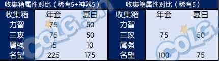 【小结】 对于礼包常年更新的角色和战令打造的角色而言,光环适合分解或兑换资格证,一个光环可以换2个资格证。 对于零基础的角色,可以临时过渡,但如可用战令的,会更优先推荐一些。 收集箱属性 夏日的收集箱属性比年套属性差一些,不可叠加。不过今年的夏日收集箱相对年套而言属性差距变小了,年套下架后回坑的玩家可以酌情考虑,性价比相对于往年更高了一些。 拉满的情况下属强差距为5,三攻和力智差25。单人打桩的情况下这里的差距在1.5%左右,组队差0.9%。