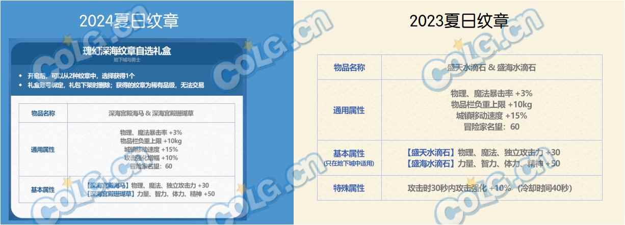 【小结】 对于礼包常年更新的角色而言,2个宠物装备的提升可以在2.6%左右。 (宠物装备是夏日礼包这次提升道具里最具价值的,不推荐拿去更换资格证) 对于战令打造和零基础的角色,不买夏日礼包的情况下选用拍卖行的宠物装备性价比不错,买夏日礼包则获得目前版本的顶级宠物装备道具,按需购入即可。 纹章属性分析 今年夏日纹章和往年相比没有任何提升,图示的23年纹章10%攻强在后续版本更新后也常驻了所以不存在区别 相对于前年,名望从40点提升到了60点,攻击的攻强属性也由8%提升到了10%,也优于出血纹章。