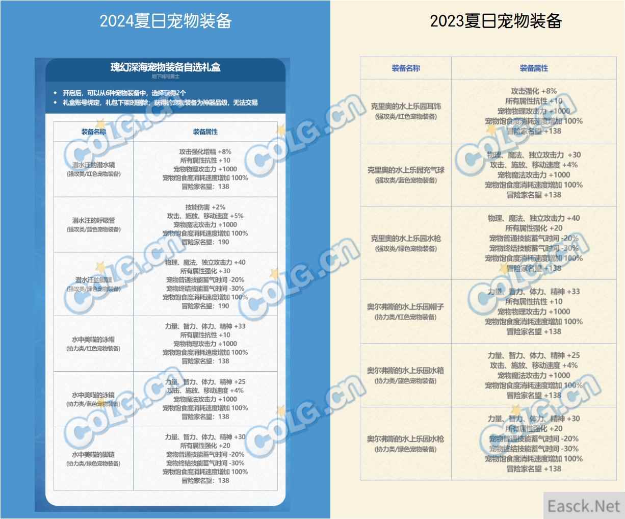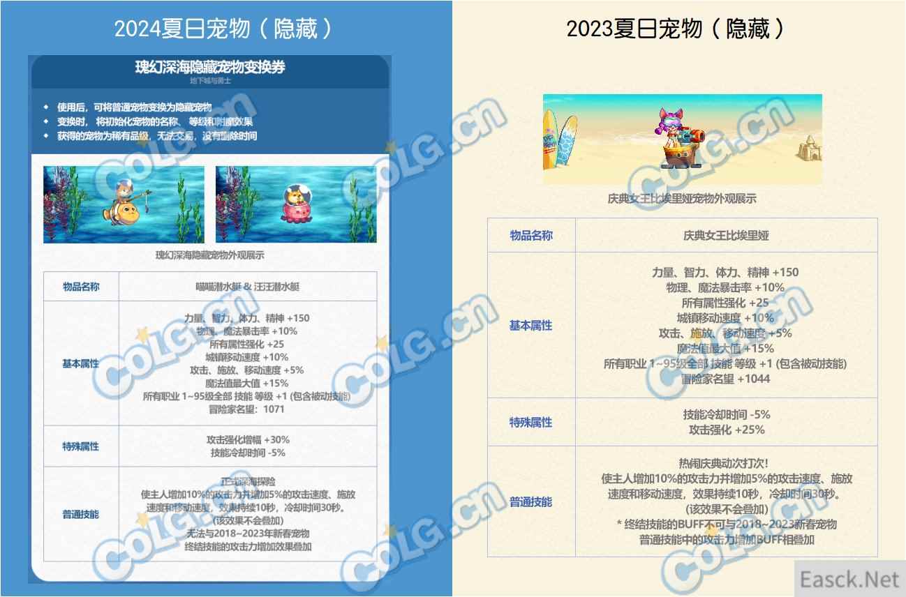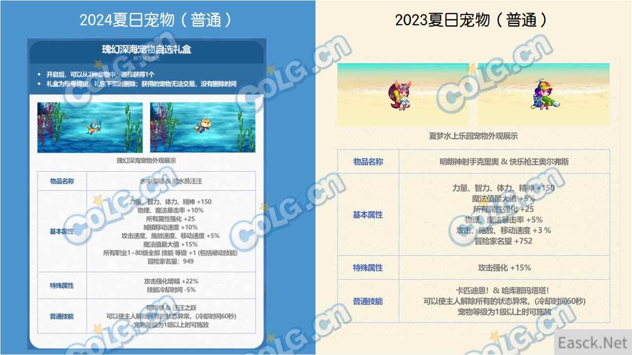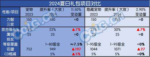 【小结】 对于礼包常年更新的角色而言,纹章没有更换的必要,适合兑换为资格证。不过纹章的资格证能兑换的比较少,只能换1个。 对于买过前年但去年夏日礼包没有购买的玩家,提升约1%。 对于战令打造和零基础的角色,以前没有快捷栏纹章,只购买夏日礼包情况下,纹章10%攻强提升可以达到5%以上,很值得入手。 宠物属性分析 今年的夏日宠物分为普通和隐藏两种。隐藏宠物升级券可以在多买多送活动用优享搭乘券去抽。属性方面,隐藏宠物的属性对标的均为同一年春节的普通年宠,考虑到夏日礼包到后续的年套周期只有半年,距离下一次宠物更新换代的角度看,性价比的角度考虑并不划算。