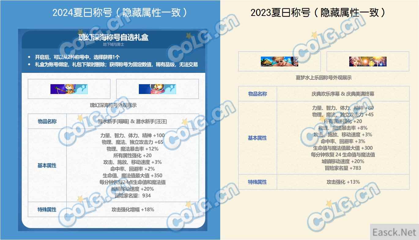 【小结】 对于礼包常年更新的角色而言,宠物没有更换的必要。可以将宠物礼盒更换为资格证,一个宠物可以兑换2个资格证。 对于战令打造和零基础的角色,夏日普通宠物过渡性能相当不错,已经有年宠的基本性能了。没有特别的必要为了升级到和今年年宠相当属性的隐藏宠物去花材料换,不过如果材料有多可以入手。 称号属性分析 夏日礼包的称号的属性一直都不是顶尖的,升级后的称号属性和普通的没有区别。 强度的对标者是2022年的普通春节称号,和24年春节称号的强度差距在3.9%左右。 相比买一套礼包,称号直接在拍卖行上购买【白云监视者】会更划算。