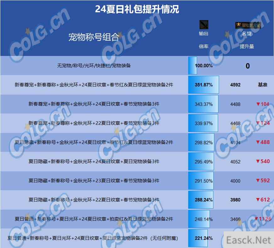 【小结】 对于礼包常年更新的角色而言,收集箱没有更换必要,倒是可以适当购入填补年套收集箱过期后的一个月空窗期。 对于战令打造和零基础的角色,夏日的收集箱可以酌情考虑。 提升率分析 首先是新起的角色,没有任何宠物,称号,光环等国服特色。如只购买1套夏日礼包,也不给宠物和称号打上附魔,直接使用的情况下,提升为121.24%。相比于国服特色拉满的251.87%的提升率而言,伤害会差距1.6倍左右。 夏日隐藏和新春的普通宠物属性是一致的,可以用来代表目前最主流的团本攻坚玩家角色的宠物强度情况。