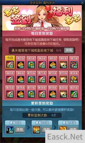 本期活动参与方式很简单,每日通关2次推荐地下城即可完成签到领取奖励 累积5/10/15次可获得额外奖励。