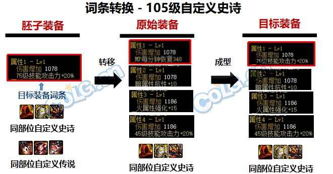 使用作为狗粮的另一件105级自定义史诗或者自定义传说的一条词条进行转换的。狗粮装备在转换后就会消失。狗粮装备在使用之前不能有增幅、附魔、徽章等打造。 但是当装备进行过一次词条转换后,其余的3条词条将会被锁定,不可以继续转换。只能改变之前变更过的那一条词条。