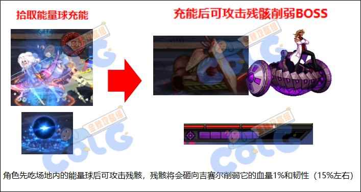 【核心机制 - 充能击破】 吉赛尔的常驻机制,场地会刷新废铁和能量球,吃完能量球充能再攻击废铁削弱BOSS 基本上每个变身阶段都能稳定破韧1次
