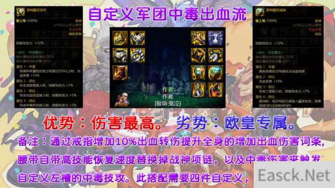 补充说明: 优势:鬼泣伤害最高的搭配。 劣势:欧皇专属,需要4件属性不错的自定义装备,戒指左槽必须是3词条以上。 备注:通过戒指增加10%出血转伤提升全身的增加出血伤害词条,腰带自带高技能恢复速度替换掉战神项链,以及中毒伤害来触发自定义左槽的中毒技攻。此搭配需要四件自定义,各位量力而行。