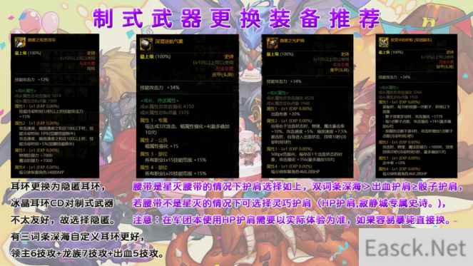 补充说明:适用于打造不高或小号等情况,成型快,伤害高,无副作用。 【3】自定义装备词条选择 自定义装备的4个词条均从词条池中随机出现,一件装备的词条池由通用词条、装备种类词条、专有词条组成。 【通用词条】所有自定义装备共享的词条池; 【装备种类词条】根据装备种类不同(武器、防具、首饰、特殊装备),相同种类装备共享的词条池; 【专有词条】该件装备独享的专有词条池; 词条池可在游戏内【百科辞典】中查看。 由于自定义装备词条组合存在大量变数,此处分享个人思路,推荐一些可行的装备和词条。 【鬼泣自定义装备推荐】 护肩:深渊自定义攻击增加40属强+15属强可用。 衣服:出血伤害+30%可用。 护腿:不推荐。 腰带:不推荐。 鞋子:不推荐。 手镯:不推荐。 项链:不推荐。 戒指:伤害10%转化为出血、出血伤害+10%、人型技攻+7%,至少有伤害10%转化为出血、出血伤害+10%可用。 左槽:龙族+7%技攻、出血+5%技攻、250抗性加15%出血伤害、属强+15,至少有龙族和出血2条属性可用。 右槽:龙族+7技攻、出血5%技攻、25属强、15属强,至少有龙族和出血2条基础属性外加一条可转移属性可用。 耳环:对领主+6%技攻、出血+5%技攻、龙族+7%技攻,至少有以上三条技攻时可用,佩戴胜负武器情况下只推荐无色冰晶耳环,吞噬本源武器才考虑佩戴自定义。 |