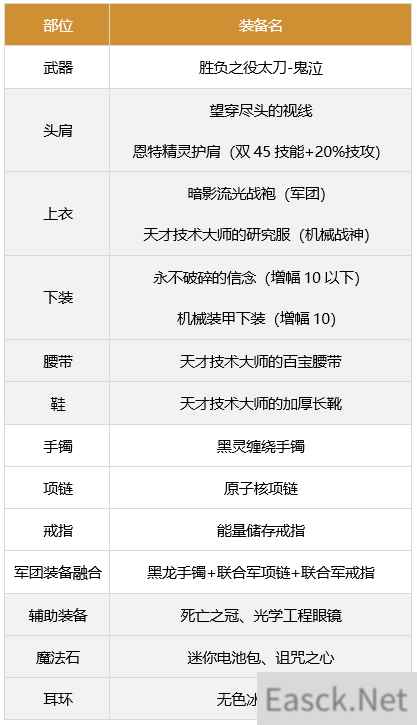 优势:容易成型,无副作用,适合大多数玩家。 劣势:相当于其他流派伤害稍低。 备注:恩特精灵护肩最低要求是双45技攻+20%的属性才可替换望穿尽头的视线,军团一直在一个房间,故衣服选择暗影流光战袍,天才衣服适合机械战神,暗影战袍适合军团。