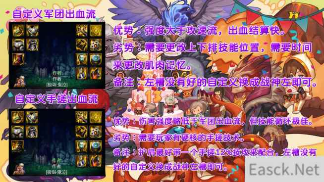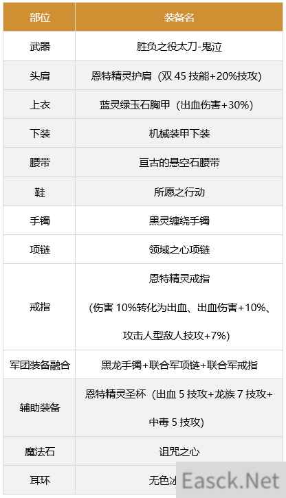 补充说明: 优势:强度非常高,速度快手感好,适合无多余自定义的玩家。 劣势:受到怪物的伤害更高,无龙袍堆140攻速较为困难。 备注:残影之凯贾存在让鬼泣能够驾驭这套装备,在满足140攻速情况下,左槽若有属性好的恩特精灵圣杯可替换光学工程眼镜左槽。 【方案三】自定义军团出血流