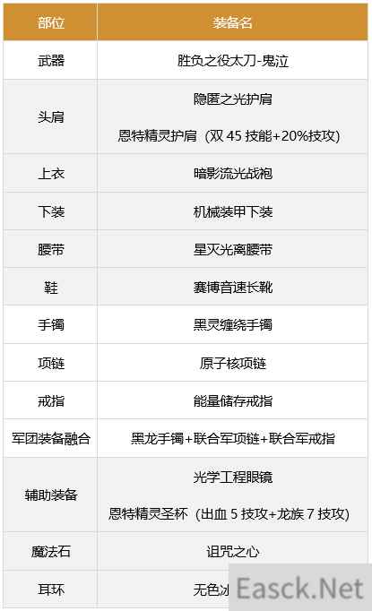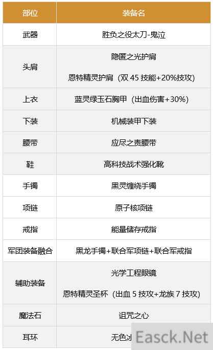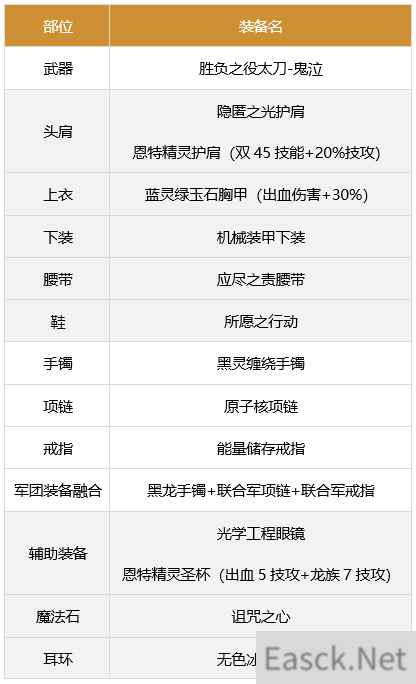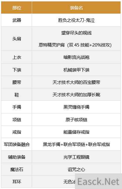 补充说明: 优势:强度略低于军团出血流稍强于攻速流,但技能循环极佳。 劣势:需要玩家有硬核的手搓技术。 备注:护肩最好在双45技能+20技攻的基础下再多一条手搓+12技攻的属性,左槽没有属性好的恩特精灵圣杯可替换为光学工程眼镜左槽。 【方案五】自定义军团中毒出血流