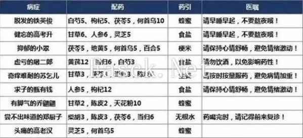 13、暴躁的屠妇人 药方:地黄10、百合10;药引:无根水;医嘱:请保存心情舒畅,避免情绪激动; 14、歪嘴的神算子 药方:甘草6、茯苓3、当归6、地龙3;药引:无根水;医嘱:药喝完时,请记得前来复诊; 15、谈恋爱的陈猎户 药方:当归4+地龙4;药引:食盐;医嘱:保持心情舒畅,避免情绪波动; 16、比武的陈猎户 药方:当归4+地龙4 ;药引:食盐;医嘱:保持心情舒畅避免情绪波动; 17、失眠的陈猎户: 药方:柴胡8+灵芝8+百合8+合欢花8;药引选择:红枣;医嘱:保持心情舒畅,避免情绪激动; 18、失恋的陈猎户: 药方:地黄6+百合10+合欢花6;药引:蜂蜜;医嘱:请勿饮酒,以免影响药性; 19:头痛的高老汉 药方:灵芝5+何首乌5;药引:蜂蜜:;医嘱:请清淡饮食,不要吃辛辣之物; 20:歪嘴的神算子 药方:甘草6+当归6+地龙3+茯苓3;药引:无根水;医嘱:要喝完记得来复诊; 21:暴躁的屠妇人 药方:地黄10+百合10;药引:无根水;医嘱:保持心情舒畅,避免情绪激动; 22:尿频的李侠士 药方:黄芪15+天花粉9;药引:无根水;医嘱:请勿饮酒,以免影响药效;
