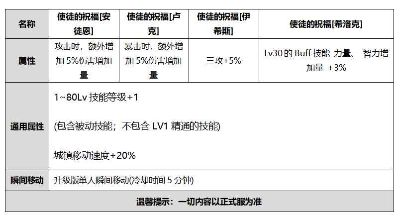 DNF使徒的祝福希洛克属性LV30的BUFF技能力量智力增加量+3%,1~80Lv技能等级+1(包含被动技能;不包含LV1精通的技能);城镇移动速度+20%;瞬间移动:升级版单人瞬间移动(冷却时间5分钟)。