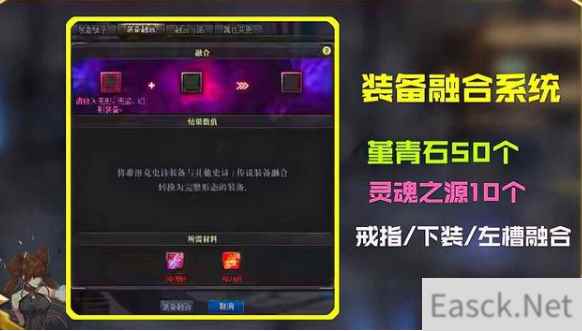 DNF希洛克装备融合材料获取了希洛克下装、戒指、左槽装备后,可以消耗“50个堇青石和10个灵魂之源”,将其和100级对应史诗融合,获取包含了两件装备词条的新史诗,同样具备原100级史诗的套装属性。