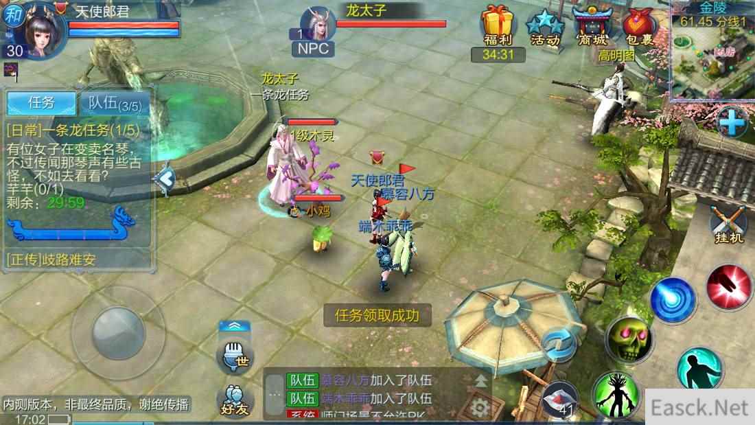 一条龙是《倩女幽魂》中的一个日常任务,玩家完成日常任务可以获得丰富的丰富技能经验与帮会资金奖励,另外在人物过程中还会有人物经验奖励,对于想要快速升级的玩家来说是不可错过的捷径。 一条龙任务介绍 活动类型:日常活动 背景介绍:盘古元神即将出世,引发三界动荡,怪事频发。玉帝为了解下界民情,特派龙太子来到人间,搜集世间奇闻异事,上达天听。但龙太子虽神通广大,面对偌大的三界也分身乏术,于是索性现身金陵,张榜悬赏,邀请各路英雄豪杰共同参与,若有人能助他调查这些奇谈轶事,他将给予丰厚的谢礼。 参与方式:3人以上组队,在金陵(61,47)处,找到NPC龙太子,领取一条龙任务,即可帮助龙太子调查三界异闻了。 奖励次数:每日前10次任务将获得多倍经验奖励,完成第11-20次任务,获得基本经验奖励。若完成次数超过20次,仅获得少量奖励。完成次数超过45次,则无法继续获得当日的奖励。 活动说明 1、领取任务 3人以上组队后,在金陵(61,47)处,找到NPC龙太子,领取一条龙任务。