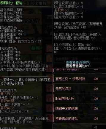 神话级部件:[融化黑暗之温暖(原融化拂晓之温暖)] [2]套装效果 物理暴击率 +5% 魔法暴击率 +5% 最终伤害 +10% 物理、魔法、独立攻击力 +10% [3]套装效果 攻击速度 +10% 移动速度 +10% 施放速度 +15% 所有职业Lv100所有技能Lv +1 攻击时,附加10%的属性伤害。(以自身攻击属性中最高属性伤害为准) - 圣骑士、小魔女专属属性(学习[圣灵之槌]后不生效) [2]套装效果 魔法师(女) [开幕!人偶剧场]技能Lv +1 圣职者(男) [天启之珠]技能Lv +1 圣职者(女) [圣光天启]技能Lv +1 [荣誉祝福]、[勇气祝福]、[禁忌诅咒]力量、智力增加量 +3% [3]套装效果 魔法师(女) [禁忌诅咒]技能Lv +1 [开幕!人偶剧场]技能Lv +1 圣职者(男) [荣誉祝福]技能Lv +1 [天启之珠]技能Lv +1 圣职者(女) [勇气祝福]技能Lv +1 [圣光天启]技能Lv +1 [荣誉祝福]、[勇气祝福]、[禁忌诅咒]力量、智力增加量 +4% [天启之珠]、[圣光天启]、[开幕!人偶剧场]力量、智力增加量 +45 [守护恩赐]体力、精神 +100 [启示:圣歌]、[人偶操纵者]智力 +100 |