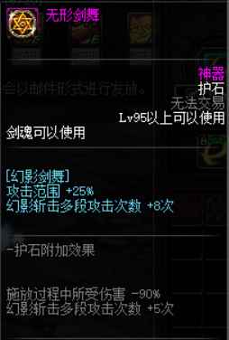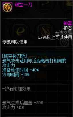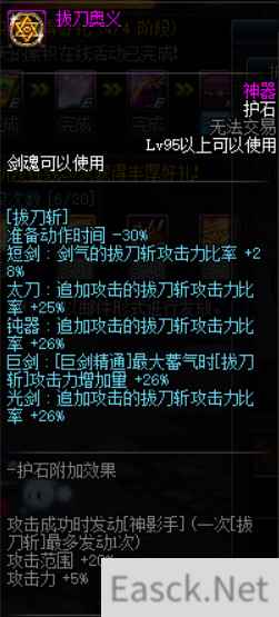准备动作时间-30%; 范围+20%; 触发一个[神影手]的剑气攻击(同时触发buff:攻击速度、移动速度+15%,持续15s)。 攻击力+5%; 第二刀追加从30%→56%(光剑为例) 100级时,伤害提升率为30.75% 总结: 解决了白手一直以来的速度问题,更大意义适合搬砖。 由于拔刀斩的常规cd正好为15s(光剑更短),相当于不用切换武器即可获取全程的加速状态。 越来越多的副本出现控制免疫等状态,拔刀这样快速一/二段的技能能保证伤害不丢失,是首选的CP护石之一。 由于100级版本尤其是军神套对速度的要求,对触发神影手加速的需求增加,更推荐此护石。 2. 猛龙过江【猛龙断空斩】