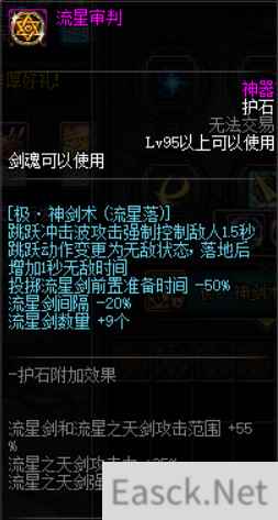 全程无敌,落地后持续短时无敌; 上升时也可以控制敌人1.5s; 上升到落剑间隔-50%; 落剑间隔-20%; 流星剑从38增加到47(+9); 流星剑和极·神剑术投掷的天剑攻击范围+55%; 极·神剑术投掷的天剑攻击力+35%; 极·神剑术投掷的天剑控制时间(每一把)从1.25s增加到2s(+60%) 100级时,伤害提升率为18.59% 总结: CP护石将功能性发挥到机制,但是对伤害加成低,输出时间也没有改善。 更大意义在于打HIT数,以及控制、无敌等一口气优化。 更大的优化越来越想让人在技能点1,真不愧是优秀的控制+无敌技能。 额外伤害加成加到了被动投掷的天剑,导致技能伤害也没有前三个大。 5. 破空一刀【破空拔刀斩】