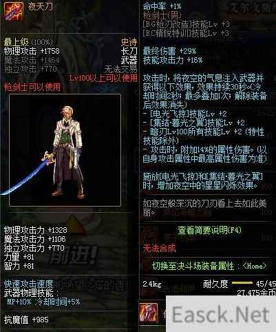 物理攻击力 +1328 魔法项击力 +1106 独立攻击力 +770 力量 +81 智力 +81 抗魔值 +985 冰属性抗性 +20 暗属性抗性 +20 冰属性攻击 暗属性攻击 命中率 +1% 枪剑士(男) [B.G枪刃改造]技能Lv +3 [B.C精锐特训]技能Lv +3 最终伤害 +29% 技能攻击力 +16% 攻击时,将夜空的气息注入武器并获得以下效果,效果持续30秒。(冷却时间2秒,最多叠加1次,解除装备后效果消失) - [电光飞掠]技能Lv +2 - [集结·暮光之翼]技能Lv +2 - 暗刀Lv100所有技能Lv +2 (特性技能除外) - 攻击时,附加14%的属性伤害。(以自身攻击属性中最高属性伤害为准) 施放[电光飞掠]和[集结·暮光之翼]时,增加夜空中的星星闪烁效果。 |