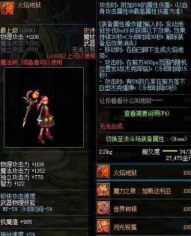 物理攻击力 +1106 魔法攻击力 +1352 独立攻击力 +770 智力 +122 抗魔值 +985 施放速度 +5% 命中率 -1% 技能攻击力 +33% 最终伤害 +34% 攻击时,附加15%的属性伤害(以自身攻击属性中最高属性伤害为准) [装备效果指令健]输入时,发动地狱步伐buff并获得以下效果,效果持续30秒。(冷却时间30秒,解除装备后效果消失) - 移动时,在自己脚下生成火焰地带 - 攻击时,在前方400px范围内随机发动[杰克降临]。(冷却时间0.5秒) - 攻击时,有5%的几率在前方落下巨型杰克爆弹。(冷却时间10秒) |