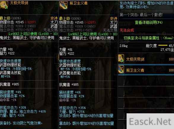 来对比一下,天帝剑和前卫主义者伤害,以血爆技能为例,防具贫瘠沙漠的遗产轻甲,首饰幸运三角,特殊是军神的隐秘遗产,有神话耳环搭配。前卫主义血爆技能,打出了237E伤害,太极天帝剑在阴阳之气下,都比其伤害高。 |