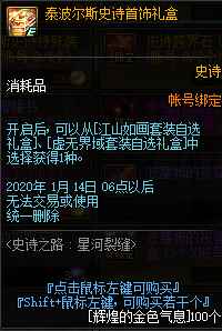 秦波尔斯史诗首饰礼盒消耗品 帐号绑定 开启后可以从江山如画套装自选 礼意滤无界域红装自送礼盒中 选择获得1种。 支塞姆的祝 2020年1月14日06点以后 无法交易或使用 统一删除 获得方法辉煌的金色气息100个 |