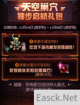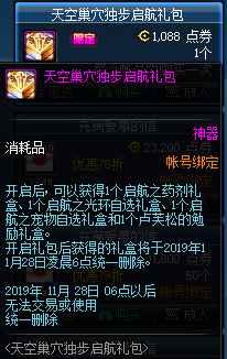 商城限时上架[天空巢穴独步启航礼包],售价1088点券,无法使用代币券购买,每个账号限购1次