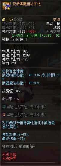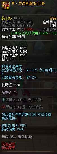 装备属性: 物理攻击力 +825 魔法攻击力 +1209 独立攻击力 +723 智力 +78 极快取出速度 武器物理技能:MP -30% 冷却时间 -10% 武器魔法技能:MP +10% 抗魔值 +858 命中率 -1% Ⅰ黑暗之力不足,无法诉求 Ⅱ黑暗之力不足,无法诉求 对武器赋予自身属性强化中数值最高的属性。 技能攻击力 +55% 最终伤害 +32% DNF界·夜语黑瞳自动手枪属性介绍