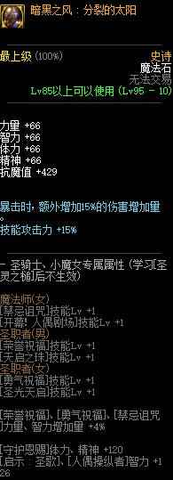 暗黑之风分裂的太阳属性好不好 力量 +66,智力 +66,体力 +66,精神 +66,抗魔值 +429,暴击时,额外增加15%的伤害增加量,技能攻击力 +15%。 - 圣骑士、小魔女专属属性(学习[圣灵之槌]后不生效) 魔法师(女), [禁忌诅咒]技能Lv +1,[开幕!人偶剧场]技能Lv +1。 圣职者(男) [荣誉祝福]技能Lv +1,[天启之珠]技能Lv +1。 圣职者(女) [勇气祝福]技能Lv +1,[圣光天启]技能Lv +1。 [荣誉祝福]、[勇气祝福]、[禁忌诅咒]力量、智力增加量 +4%。 [守护恩赐]体力、精神 +120。 [启示:圣歌]、[人偶操纵者]智力 +126。 |