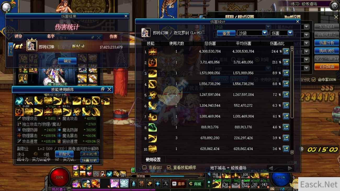 DNF剑影打桩伤害怎么样 修炼场练了20分钟,逐渐摸索出了剑影的玩法,测试了几次图上的一二觉没有白爆。 在15秒里,应该还能穿插几个点1的本体技能,但是手残不好手搓。 剑影技能因为出招快速,所以说真神人完全可以在连招中途就能手搓出只点一级的技能增加不少伤害。 哪里还能提升的,希望大佬们给个意见。 打造方面,国庆光环,换装,附魔什么的都没弄好,缺的东西还能多,目前是超界1。