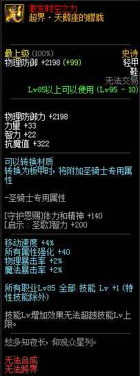 物理防御力 +2198 力量 +33 智力 +22 抗魔值 +322 移动速度 +4% 所有属性强化 +40 物理暴击率 +2% 魔法暴击率 +2% 所有职业85级技能Lv +1(特性技能除外) |
