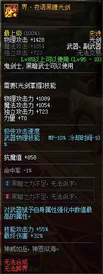 界夜语黑瞳光剑属性 物理攻击力 +1089 魔法攻击力 +1054 独立攻击力 +723 力量 +78 极快攻击速度 武器物理技能:MP -10% 冷却时间 -10% 抗魔值 +858 命中率 -1% Ⅰ黑暗之力不足,无法诉求 Ⅱ黑暗之力不足,无法诉求 对武器赋予自身属性强化中数值最高的属性。 技能攻击力 +55% 最终伤害 +32% |