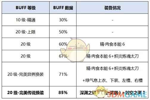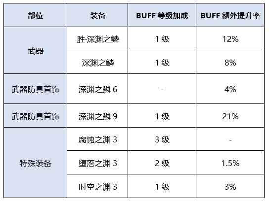 换装搭配新换装以深渊之鳞9件套(防具5+首饰3+武器1)为基础,之后视个人情况选择不同的特殊三件套进行搭配。新传说换装自带BUFF等级加成,相比异界与绿气息换装达成完美的难度降低。以完美换装为例,装备自带3级BUFF,计算时装、宠物、光环、称号4级后,再堆3级即可完美,相比完美异界换装需要的6级成本降低。下表为不同搭配的装备带来的等级、额外提升率。【深渊之鳞+胜·武器+时空之渊】为完美换装。