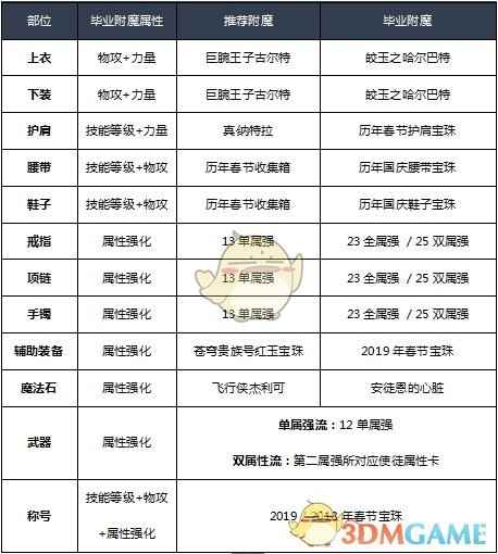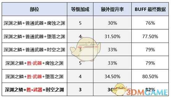 从上图来看,时空之渊搭配胜武器、深渊之鳞提升最大,所以用剑神新换装特殊装备用时空之渊最好。 换装搭配新换装以深渊之鳞9件套(防具5+首饰3+武器1)为基础,之后视个人情况选择不同的特殊三件套进行搭配。新传说换装自带BUFF等级加成,相比异界与绿气息换装达成完美的难度降低。以完美换装为例,装备自带3级BUFF,计算时装、宠物、光环、称号4级后,再堆3级即可完美,相比完美异界换装需要的6级成本降低。下表为不同搭配的装备带来的等级、额外提升率。【深渊之鳞+胜·武器+时空之渊】为完美换装。 附魔 请灵活使用百科词典中的卡片词典。