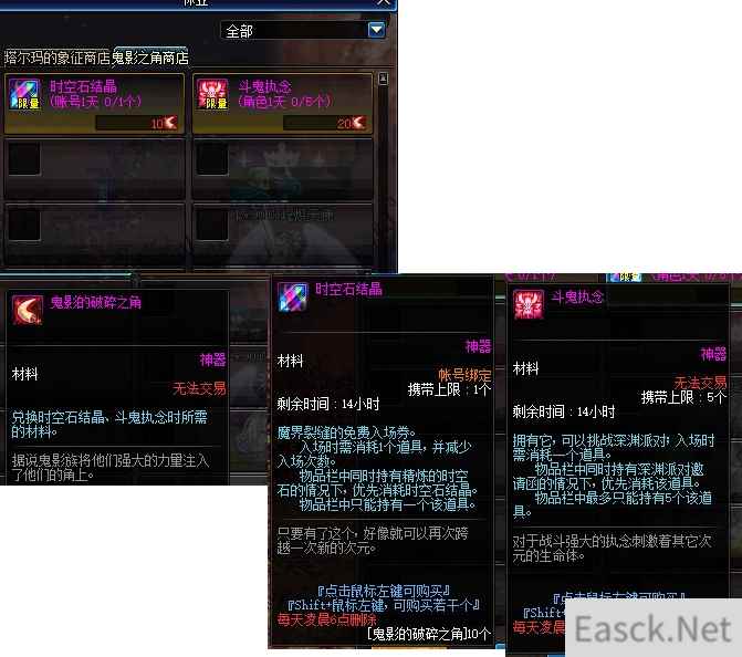 5、其中副本中获得的鬼影的破碎之角道具可以用来兑换时空石结晶(魔界裂缝入场券)和斗鬼执念(深渊入场券)。