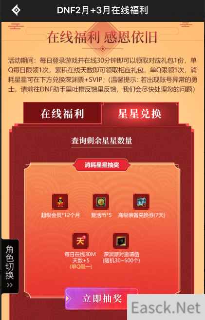 6.在线福利,每月必出的在线福利活动,使用星星可以抽奖,奖励极大概率是5个复活币(深渊票已经给的很多了,星星还是用来抽复活币吧)