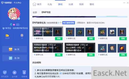 8.电脑管家徽章礼包,每天在线30分钟可以获取1枚徽章,使用徽章可以领取礼包(每月都可以领)