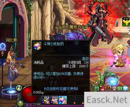 其二是头上火球的玩家会吸引boss,这时候带球的玩家就要靠走位躲,用跳跃的方式最好躲,其他人只要远离带火球的人躲地上boss走过的火路就行了,熟练的基本上不会出现死亡。 以上是打怪物的一些技巧,而下面则是一些消耗品的使用,这些药品在泰波尔斯一样是能用的。
